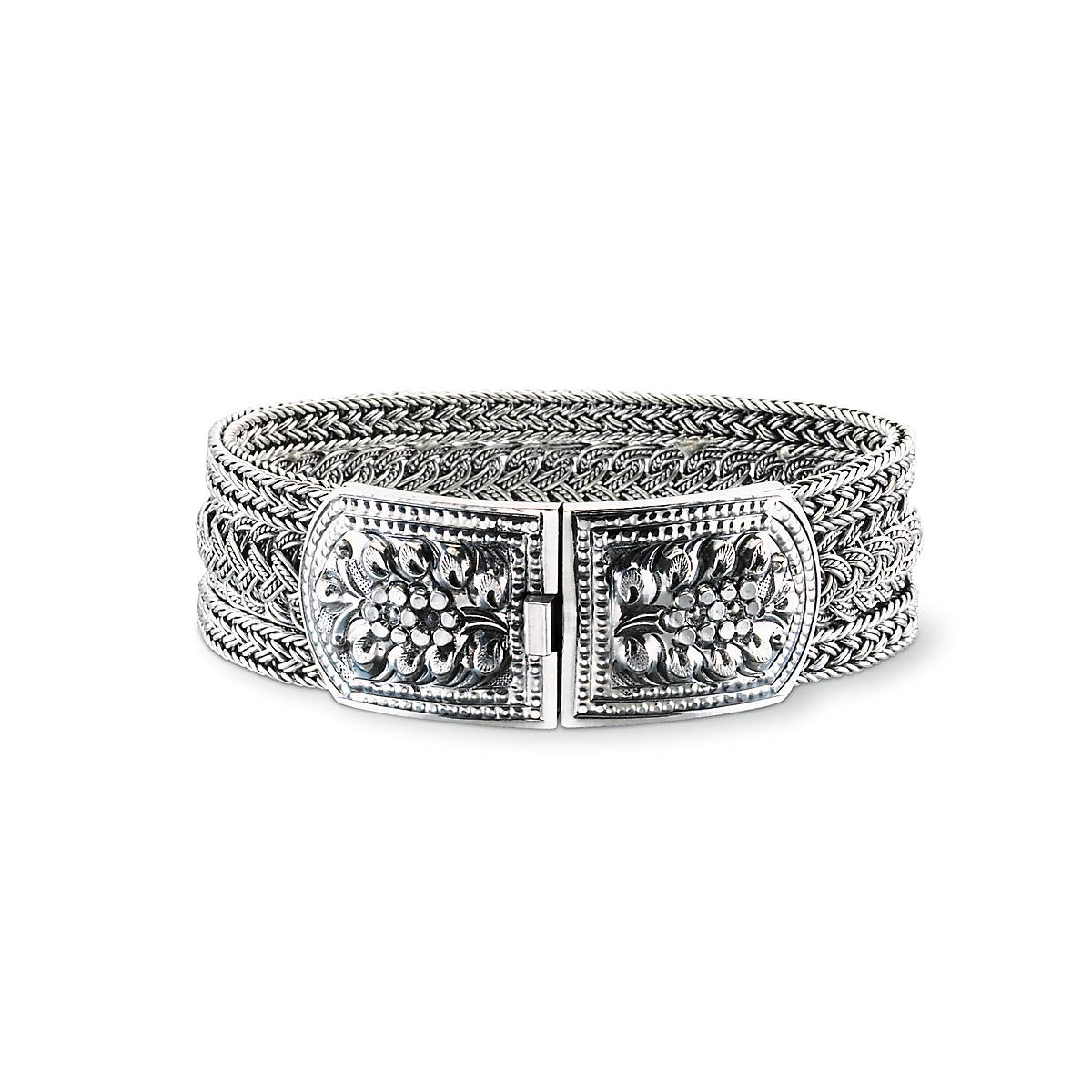 Silver Floral Bracelet: A perfect piece of jewelry to add glamour and style. This charming piece is decorated with an intricate weave design. It is crafted of sterling silver. The buckle clip is accented with a carved floral accent. Length of this bracelet is 7 3/4". It is priced for